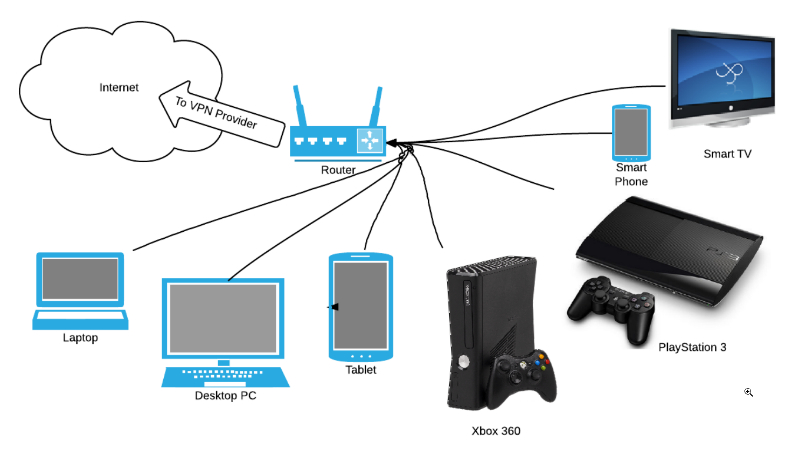 در این حالت تمام دستگاههای متصل به مودم بهصورت خودکار از VPN استفاده میکنند و نیازی به نصب نرمافزار روی هر دستگاه نیست. این روش برای افرادی که میخواهند کنسول بازی را به VPN وصل کنند کاربردی است.