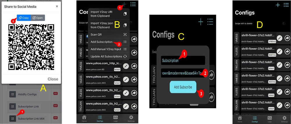Scan QR — اگر QR داری، این گزینه رو بزن و با دوربین QR رو اسکن کن تا کانفیگها اضافه بشن.